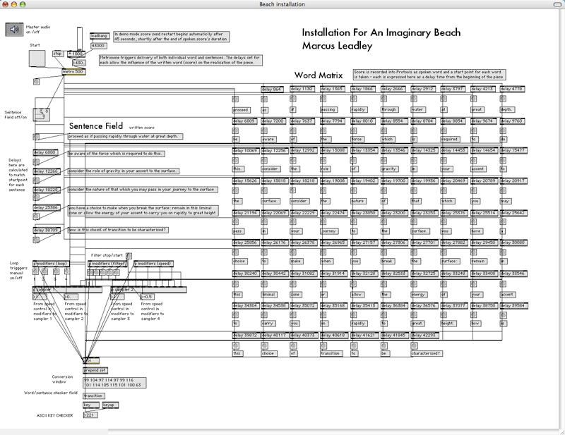 A very different approach to composition! The same sound files are loaded into a patch called Collidescope which I developed using a software called Max/MSP. You can use it to make your own applications and this patch is designed to trigger the playback of multiple sound files in time with the ‘reading’ of a written score you don’t actually hear. The pace of my spoken word delivery sets the timing for the triggers, but the files and the way they play are controlled by a series of random processes embedded into the software. The result is a loosely structured sound collage which has a certain pace and sense of internal logic. I really like the results I can create with Collidescope because I get to hear outcomes I would never have thought up. Collidescope also mangles the sounds a lot more and the result is more surreal and angular – and where the real and unreal intersect we find the territory of dreams.